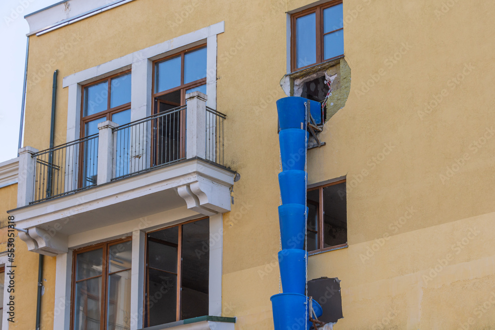 Pipe for debris, waste tube. Blue telescope rubble chute. Plastic garbage chute fixed on facade. Repair in apartment, office of old historical building. Disposal of construction waste from height.