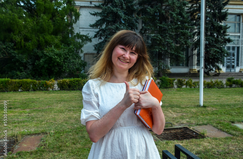 Portrait of a smiling female student in white dress holding books and showing thumb up.