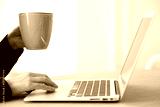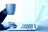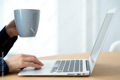 Close up of female hands working using laptop and holding cup. Selective focus on hands. Blurred background. Copy space.
