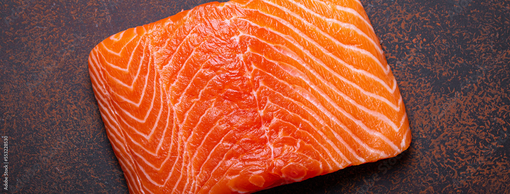 Piece of fresh Norwegian raw salmon fillet on dark brown rustic background top view, healthy nutrition and diet