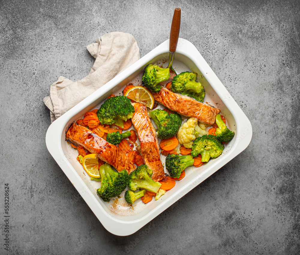 Top view of healthy baked fish salmon steaks, broccoli, cauliflower, carrot in casserole dish. Cooking a delicious low carb dinner, healthy nutrition concept
