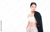 Slender beautiful woman model portrait Diet girl has perfect shape Beauty young Asian female with beautiful body She holding suit isolated on white background with copy space for text or advertisement