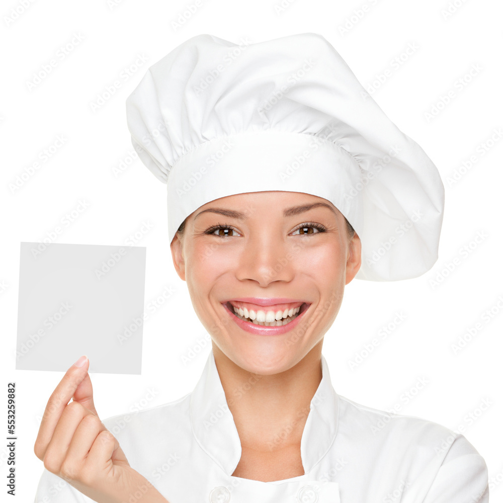 Chef, baker or cook woman showing blank card in chefs uniform. Blank card for menu, gift card, offer etc. Beautiful young Asian / Caucasian female woman isolated cutout PNG on transparent background.