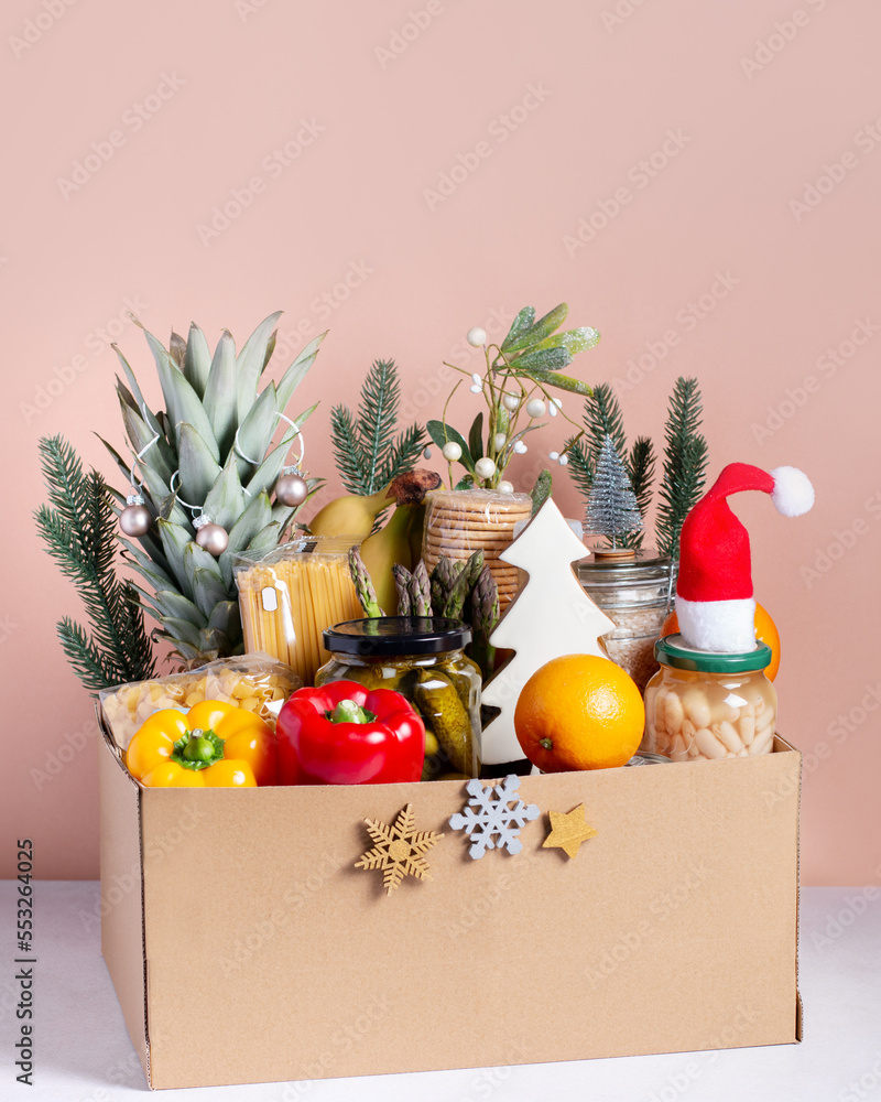 Canned food, pasta, fruits and vegetables in a box for donation decorated for Christmas, charity concept
