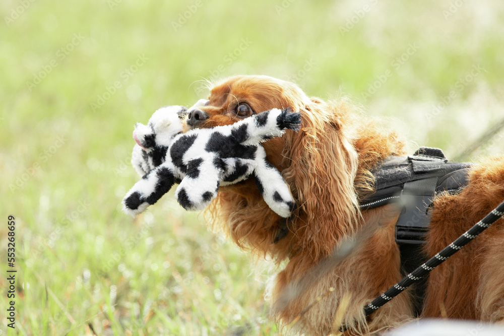 King Charles Cavalier dog holding a stuffed toy.