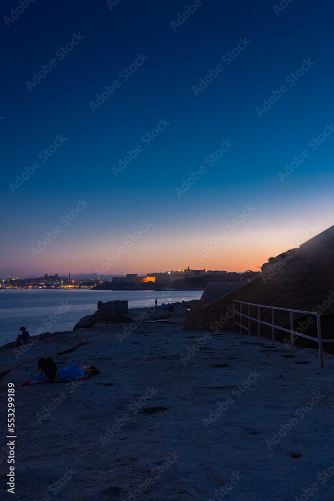 Sliema, Malta, 22 May 2022: View of the coast in front of Valletta skyline at night