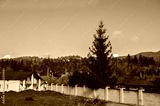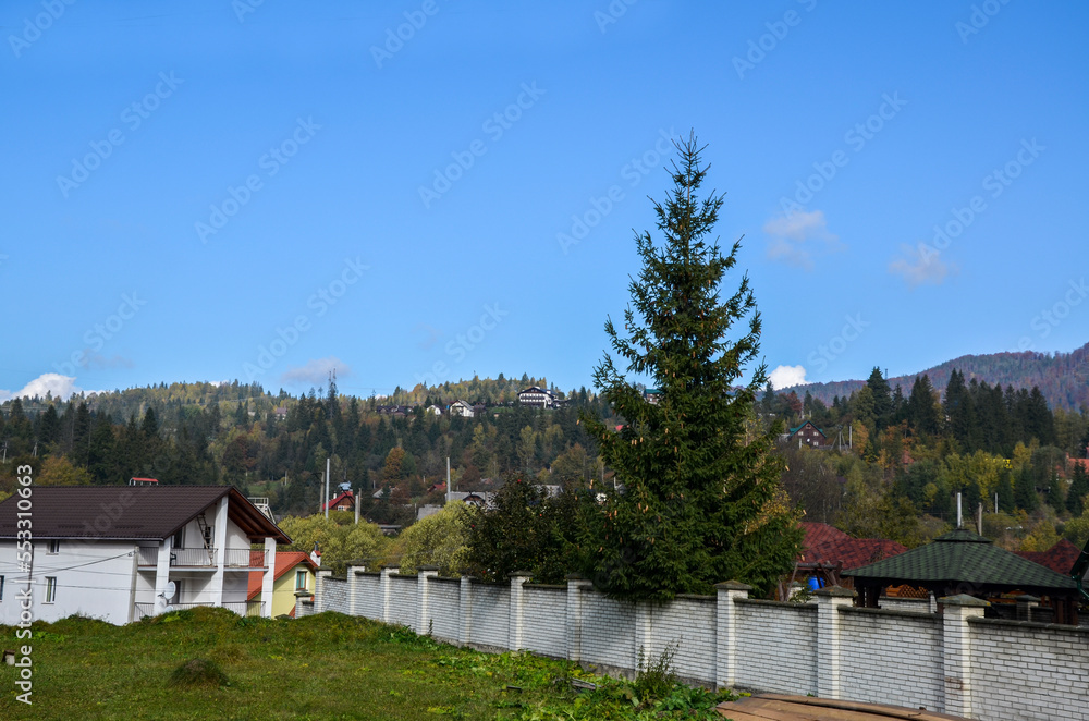 Colorful landscape of village with houses on wide hills slopes between autumn forest trees in Ukrainian Carpathian mountains
