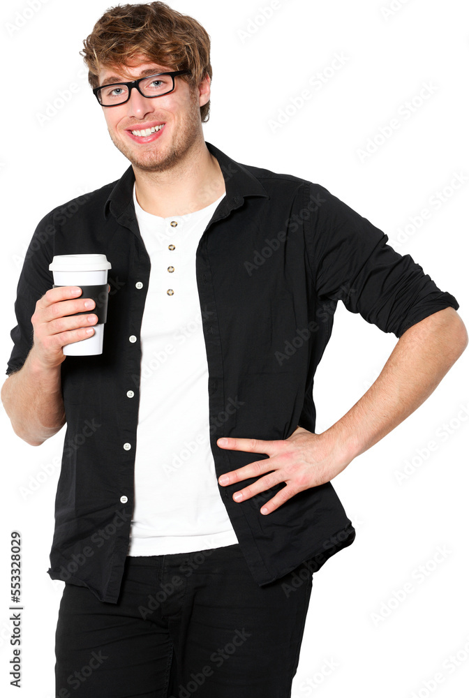 Young man drinking coffee portrait. Smiling happy male university student with drinking disposable coffee. Young male model in his twenties isolated cutout PNG on transparent background.