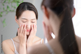洗面台で洗顔や化粧水を塗る美しい女性