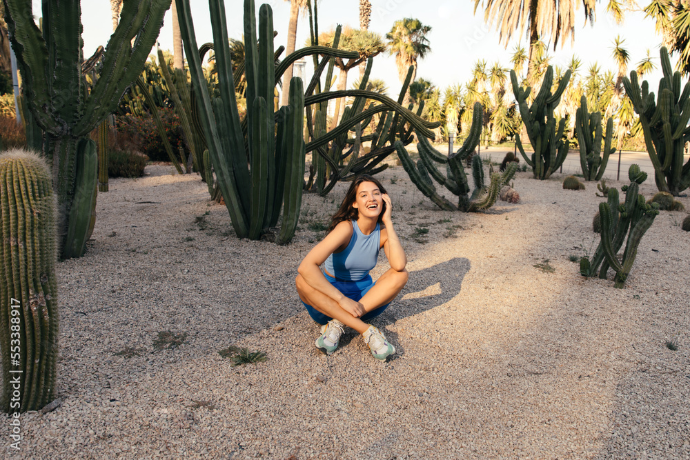 In full length of smiling young caucasian woman looks at camera sitts at sand during summer morning. Model with brunette wavy hair wears blue sport suit. Concept of positive morning, great mood.
