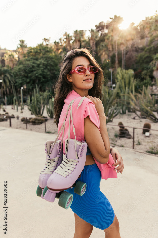 Beautiful young caucasian female looking at camera stands with roller for skating. Model with brunette wears pink sweater and blue sport suit. Rest time concept.