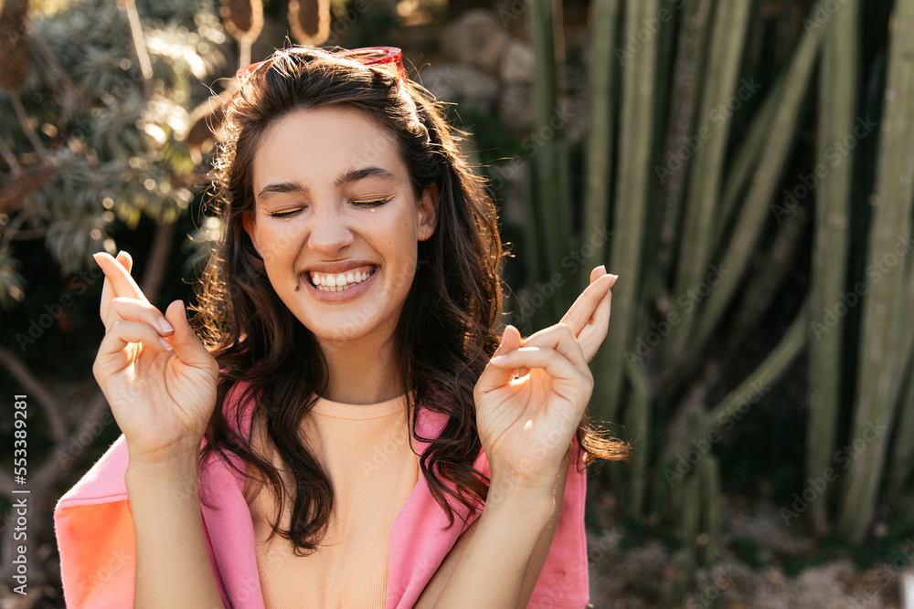 Positive young caucasian girl looking into distance, smiling with teeth standing at street. Brunette woman wears light top. Concept positive emotions.