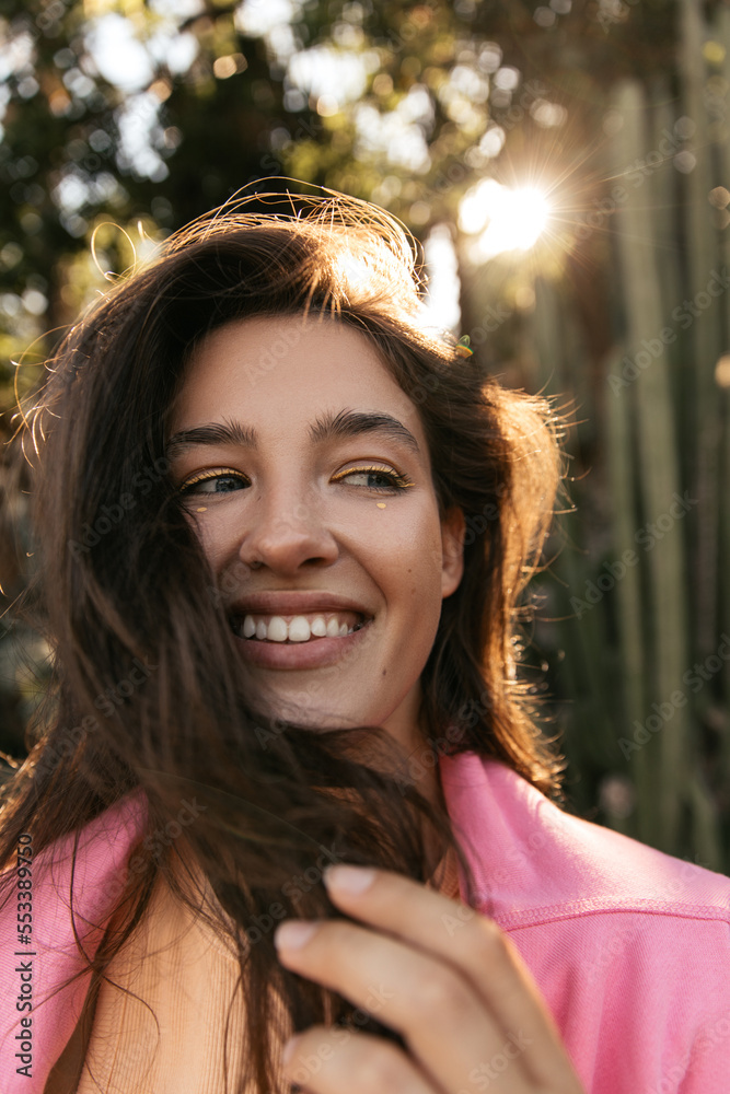 Close-up of positive young caucasian woman looking away smiling with teeth during sunny weather. Brunette wears top and pink sweater. Concept mood.