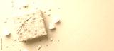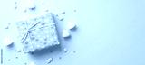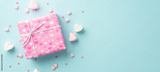 Valentine's Day concept. Top view photo of pink giftbox heart shaped marshmallow and sprinkles on isolated pastel blue background with empty space