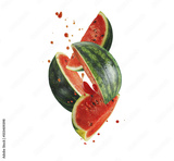 Flying pieces of watermelon with juice splashing and drops, isolated