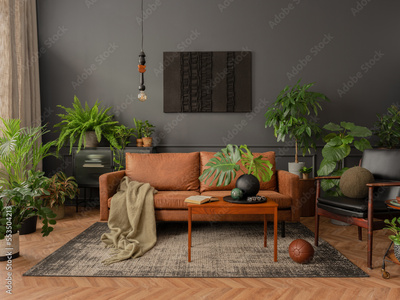 Interior design of living room interior with mock up poster frame, brown sofa, plants, wooden coffee table, lamp, ball, stylish rug, plaid, pillows and personal accessories. Home decor. Template.