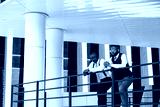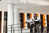 Portrait of two dark-skinned businessmen talking in the background of a modern building exterior. Friendly meeting outdoors
