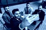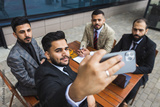 Business people outdoor meeting. Friends business partners take a selfie at a meeting. An international group of men in suits sit at an outdoor table and talking.