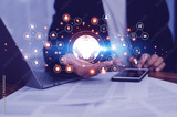 Global solution concept, hand touch on world Global solution business management corporate, Global solution design for business solution background