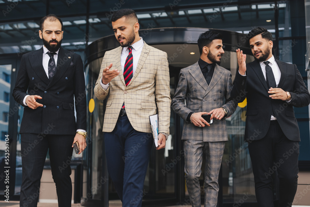 Business people outdoor meeting, A group of male businessmen in suits exit the front door of a glass building. Working break. Teamwork and brainstorming. Successful teamwork