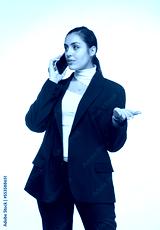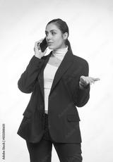 businesswoman emotionally talking on a smartphone on a white background isolated
