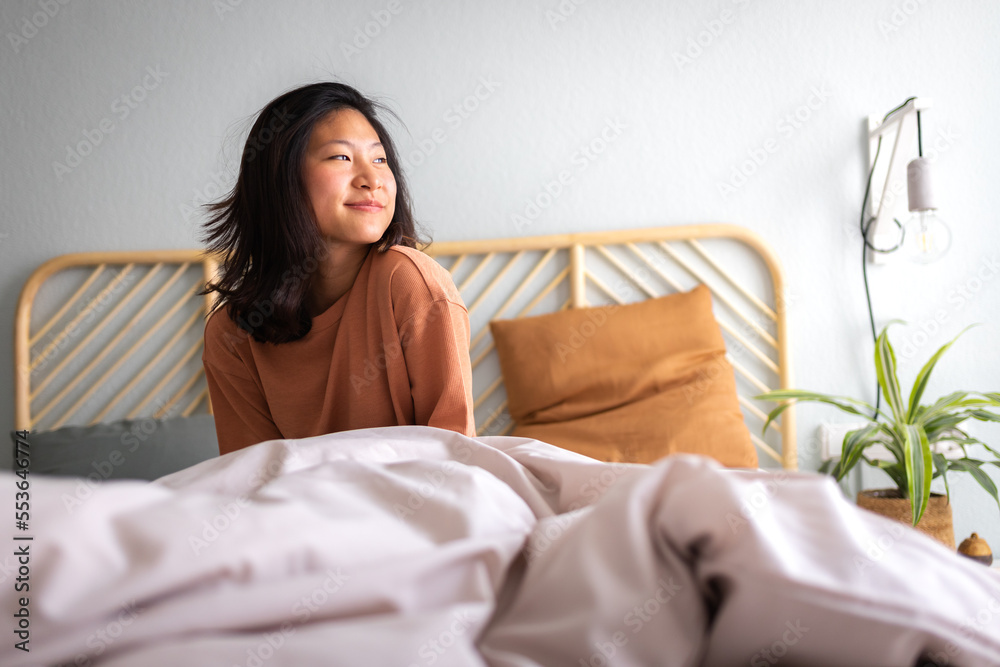 Happy young asian woman sitting on bed after waking up in the morning in beautiful, cozy bedroom at home. Lifestyle