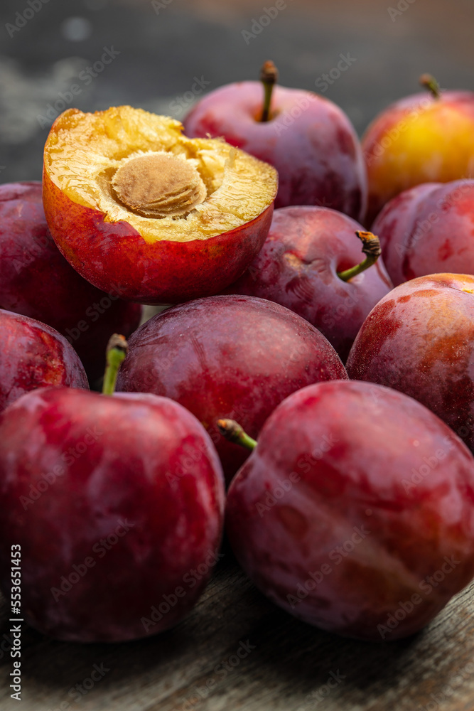 Fresh plum. Red whole plums on a dark background. vertical image. top view