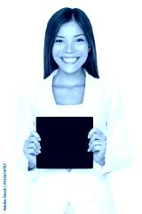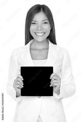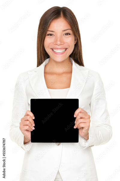 Smiling beautiful young Asian woman holding a small square black card with copyspace for your text or advertising isolated cutout PNG on transparent background.