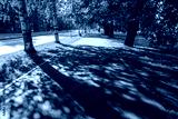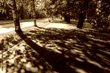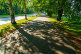 Pedestrian paved sidewalks between birches and poplars in shady sunny city park