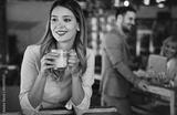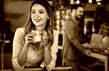 Portrait of happy young business woman drinking coffee in a break. In the background, her colleagues