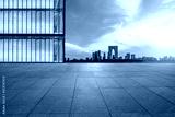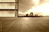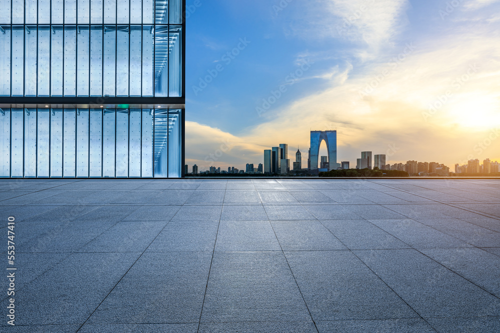 Empty floor and modern city skyline with building at sunset in Suzhou, China.