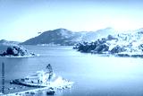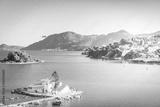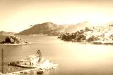 Kassiopi shore line with landing plane, Corfu Greece, toned