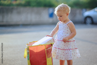 Cute baby girl helping to unpack products from shopping bag