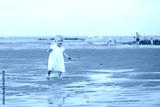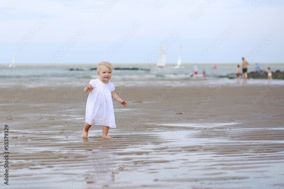 Cute blond baby girl walking along the beach on the seashore