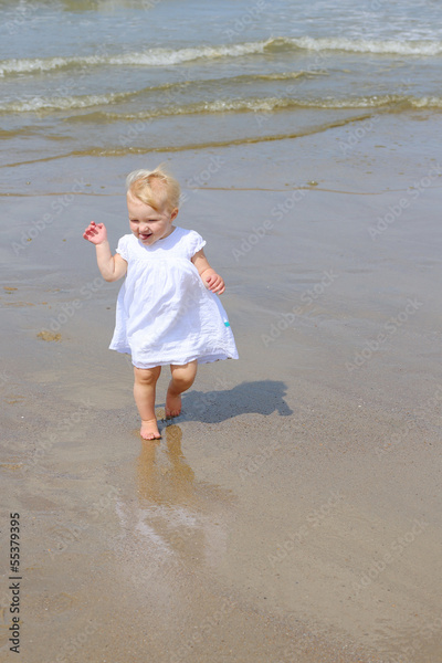 Funny blond baby girl walking along the beach on the seashore