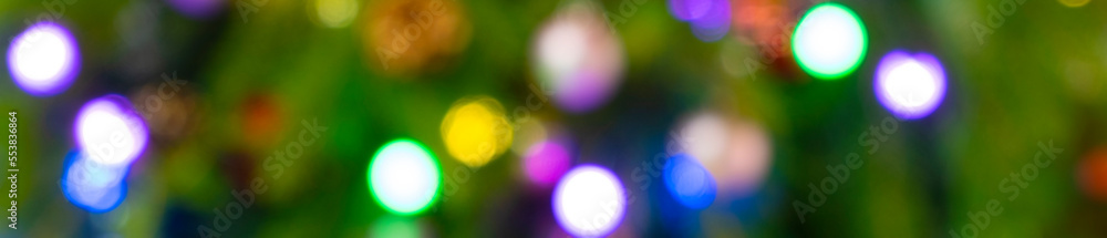 Out of focus image of a Christmas tree decorated with colorful ornaments and lights
