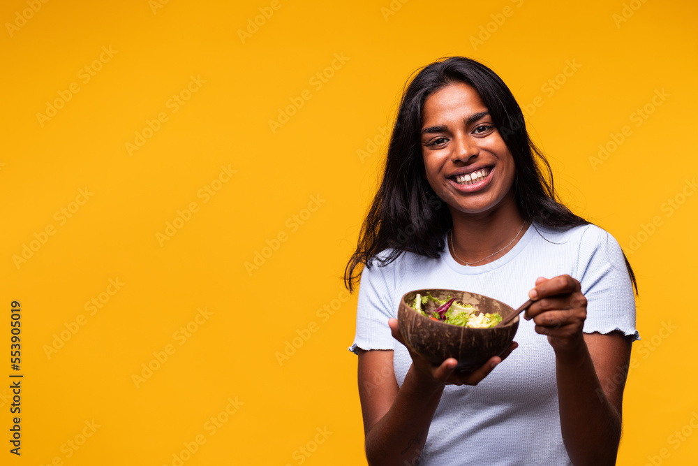 Happy young Indian woman eating healthy salad looking at camera. Isolated on yellow background. Studio shot.
