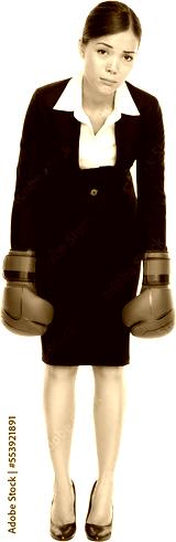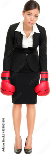 Defeated loser woman - business concept with businesswoman wearing boxing gloves standing and looking hopeless. Young Asian / Caucasian professional isolated cutout PNG on transparent background.