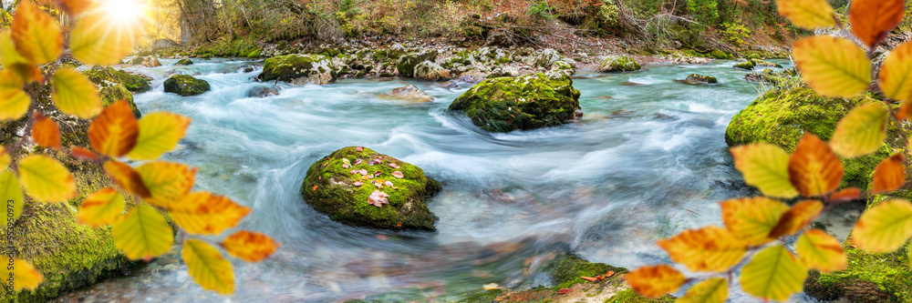 beautiful wild river with clear water in ravine