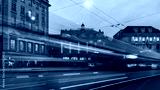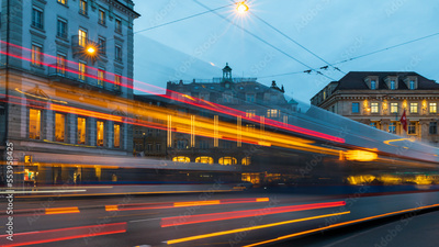 Scenic panorama of the city center of Lucerne, Switzerland at dusk. Long exposure photography of the Lucerne city center with trails of night lights. Lucerne city center