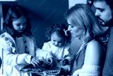 happy family enjoying their time together at home in the kitchen. Christmas tree on background.