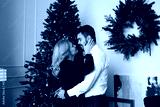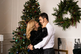 Couple people are celebrating christmas and holidays happily near beautifully decorated christmas tree, christmas concept