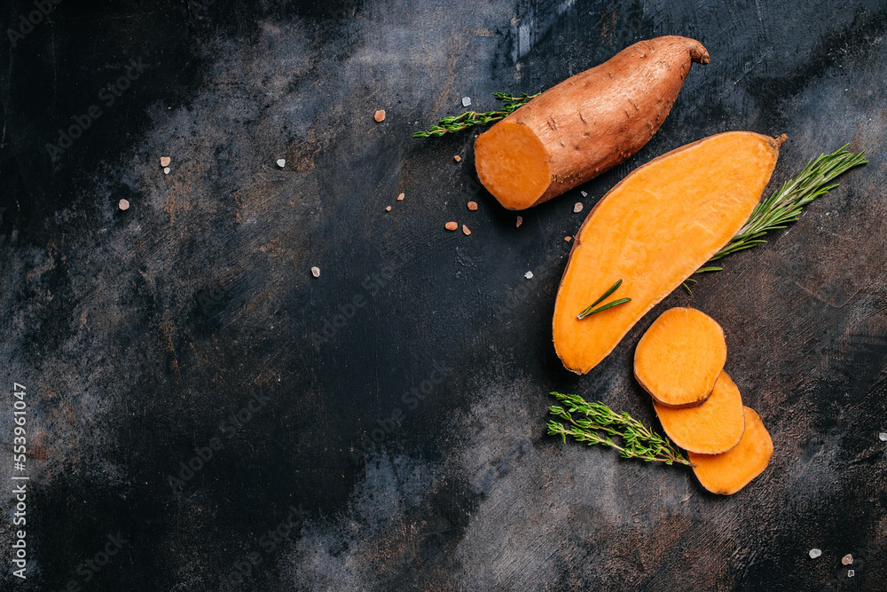 Louisiana Beauregard Sweet Potatoes, Organic orange sweet potato or batatas. vegan food ingredient. banner, menu, recipe place for text, top view