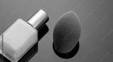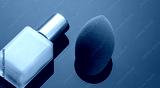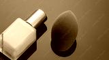Purple makeup sponge on dark background. Soft makeup cosmetic sponge. Flat-ended makeup sponge with blur makeup foundation bottle. Liquid beige make-up foundation and beauty blender. Cosmetic product.