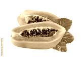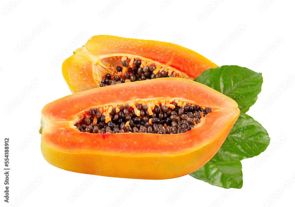 ripe papaya fruit with seeds and leaf isolated on transparent png