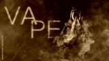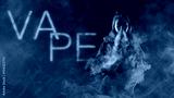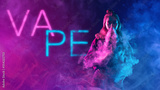 Vape woman. Lady vaper and smoke. Girl enjoy smoking vape. Woman smokes e-cigarette blows smoke from nose. Vape logo in neon light. Concept selling vaping devices. Electronic cigarette in hands woman