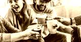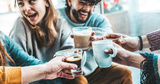Happy friends having breakfast together at cafe bar - Group of young people drinking coffee and fresh juice sitting at brunch restaurant - Food and drink concept