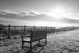 Isolated wooden park bench seen on a cliff overlooking a cold North Sea during early morning.