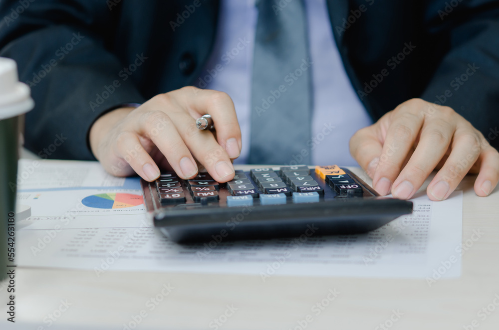 businessman or accountant thinking with calculator, checking accounting and corporate tax documents.Business report financial and accounting.