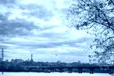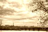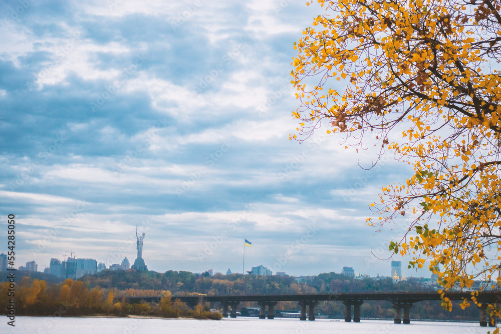 Autumn in Kyiv. Tree with yellow leaves on the background of the flag of Ukraine